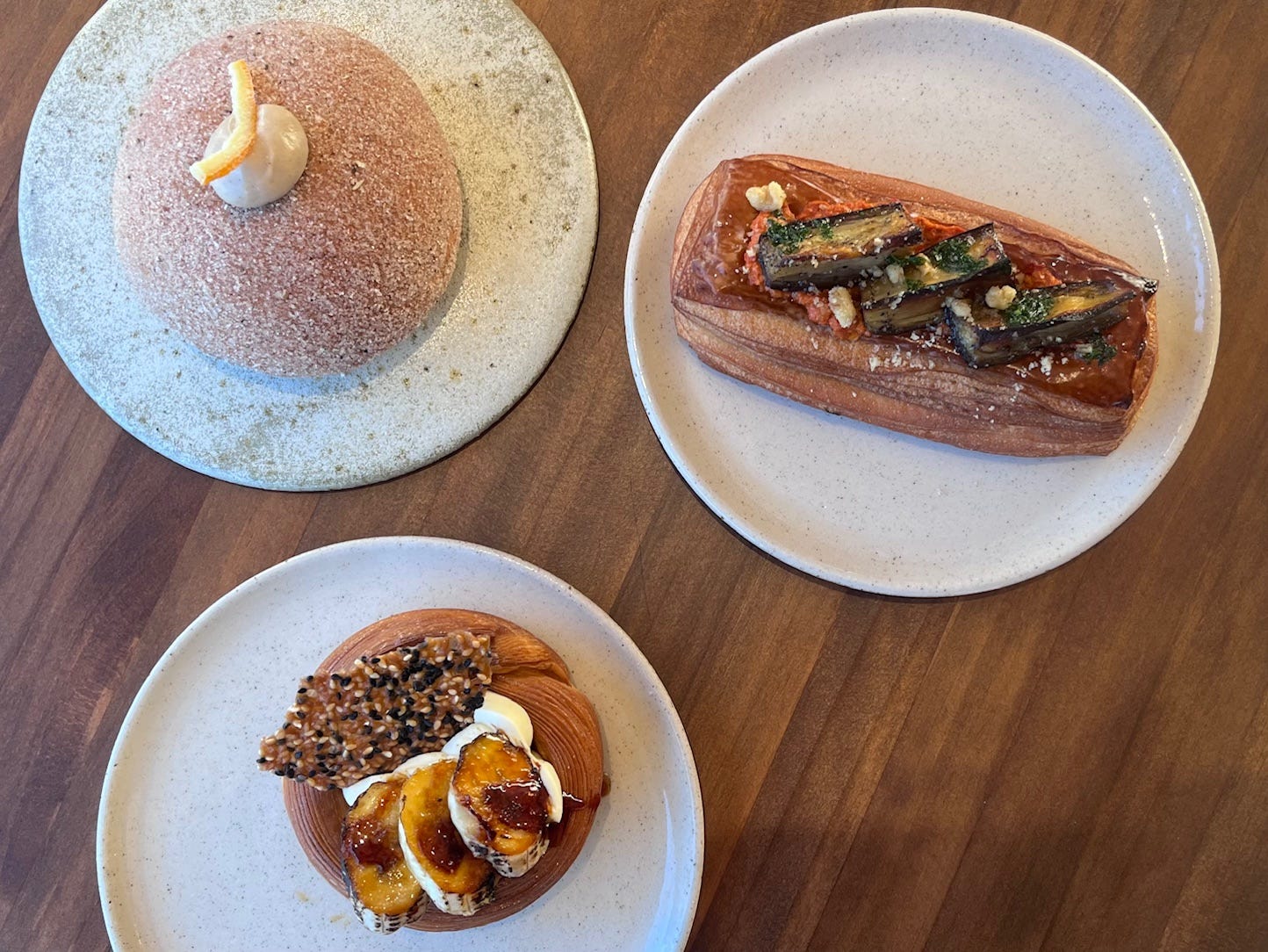 A couple of choices had already sold out, including one on my hitlist: the za’atar cruffin with whipped feta and sumac pickled onion. But my other top three were there on the counter: the uber popular chai orange bun, banana brûlée and roasted aubergine danish, all pictured above. Items for next time? Perhaps a whipped coffee ganache bun with hazelnut praline and dark chocolate glaze, a saffron pear danish or a bostock (a croissant loaf with orange blossom frangipane, blueberries and flaked almonds).